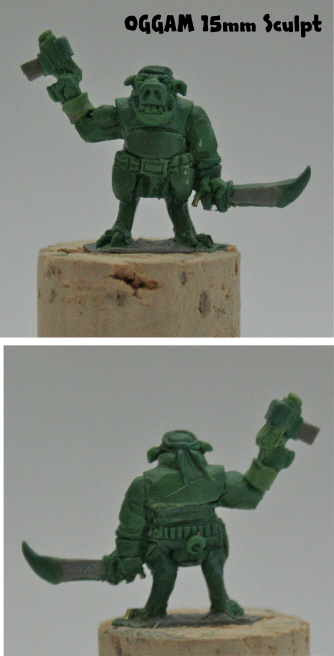 I thought you guys would like to see the first finished 15mm Oggam green. All that’s left to do is the end of the blade, which I want to be a little less curved, a bit more angular. I am loving the final look, it evokes exactly how I envisioned to Oggam to appear. I will start doing more concept sketches for the other figures now I have a good firm idea of what troop types I really want. The idea is to produce the first set of Oggam as generic to scifi as possible, but keeping in mind the back ground factions etc. That way, anyone could have a force of Oggam to use in any system, and if you really wanted to follow the background factions and make your Oggam force any Oggam faction from that. I would introduce more specialised troops afterwards (these first lot are intended just to be infantry fodder) but other types will/should include: Uggaram Iron legion Ogborg (Bionic Oggam), Uggaram Iron legion Power armour (A bit like a cross between a dustbin and the robot dog out of “wallace and grommit”), League of Anthracks Fire warriors (Heavy flame throwers & flame proof suits) League of Anthracks Doom sayers of the Black Pig (Fanatic cultists), Scrofa tribe   Hoggit gangs (Tribal pig bikers), Empire of Og Imperial guard, Iron legion flying pig squadron (Jet packs) and a whole load of other troop types I have in mind. OK, so it will take some time, and yes I am hoping that my next attempt at getting funded will fare a lot better than the last. This time I will have a ton of stuff ready and will be prepared a hell of a lot more. I hope that any of you good people will help push forward what I’m trying to do. Please give me feed back and suggestions/advice, I take all on board (within reason) Anyway, here’s piggy!…