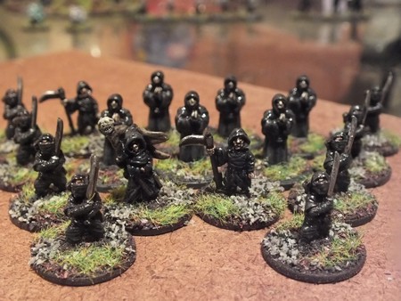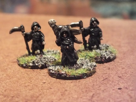 Who’s to say they don’t carry a hand weapon under their ninja robes? However I would like some that did have a handgun showing (If you can obtain them in 15mm?) Interestingly also in the figures she got me were some robed figures,one with a banner with a skull atop (Ideal for my icon bearer) and two hooded figures armed with scythes (ala the grim reaper) These have been assimilated into the doomsday cult ready to bring 15mm scale elder god style carnage to my tabletop soon! the great thing about the cult is its usable in other genres too, I have a feeling I’m going to have to do a full army…..