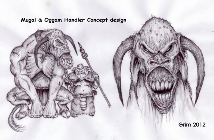 I want to show you a taste of some Oggam stuff that’s still in the works, first up is this concept design for a trained Mugal and it’s Oggam handler. For those who haven’t been paying attention to the Ogs, A mugal is a mutant cattle beast from the Oggam homeworld, feared by most sane Oggam, but for a section of their society are sought out for use in fighting arenas, used as guardian beasts and more usually, as shock troops on the field of battle.  As with any kind of minotaur creature, they are big and deadly, and known for killing and eating stuff.