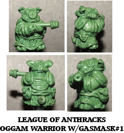 I reckon that up to four of the total ten LOA (League of Anthracks) figures from this set will be troopers like this, mostly with gasmasks and general weapons of war (a heavy too) I tried to keep as close to the original LOA gasmask design, but allowing for a variant piggy snout respirator as you can see below, the next ones will be more like the original. I thought it’d be nice to allow for some difference in what could have been too alike minis and give some additional character to them.