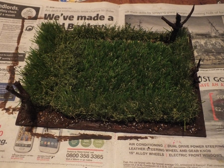 As you can see, by this point I had decided to get some stumpy looking twigs from outside and add some rocks and texture in parts with milliput, mainly to cover up any unsightly edges at the base of the turf. I usually wouldn’t waste milliput like this, but use real pebbles and rocks glued on, but I was lacking any superglue/suitable adhesive, so milliput was the next best thing (remember, I didn’t want to spend anything on making this, so my plan was to just use what I had at hand in my stuff) These were all left to dry overnight. You may also notice that once the turf was stuck down pre milliput etc, I had a good hack at the turf with a pair of scissors. This was to create more an excercise in getting rid of the uniformity of the height of the turf at the edges. If you do the same, make sure you do it outside or get something to catch the debris, the bits get everywhere!