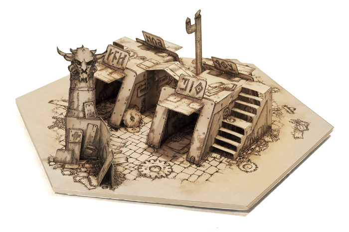 Its pop up, very much like what you’d find inside the typical kids pop up book, but far more detailed and really clever. By backing the project, you can either get the kits already printed, or simply the access to the PDF files so you can print out as many hexes of terrain as you so wish. Although the monochrome appearance might not to be everyones taste, I rather like the aged sepia coloured scheme. this does not seem to have stopped them from smashing their funding goal, and indeed, now that KS has finally let me log in, I’ve backed it too!