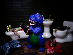 Everyone knows Barney, that “loveable” purple dinosaur of TV fame, who seems to hang around with groups of brainwashed kids in his creepy Paedo-istic (Is that really a word? No, but you get the idea) style.Well, this figure takes that disturbing vibe and amplifies it by adding an evil zombiefied edge, sharp teeth and chainsaw.