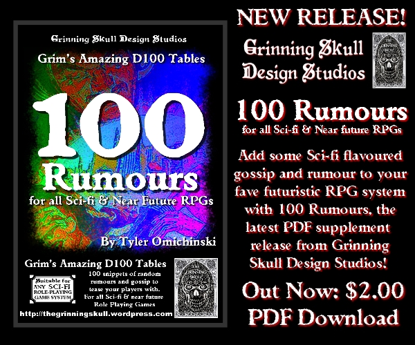 Well, it’s April already, and doesn’t the year unfold quick? Well, as ever, check out the latest release from Grinning Skull, with 100 Rumours for all Sci-fi & Near future RPGs.