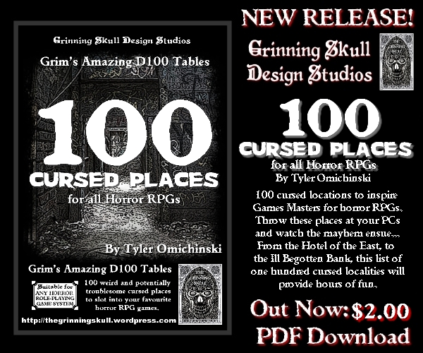 Yet more Grinning Skull Design Studios goodies on offer, this time 100 Cursed Places for all Horror RPGs by Tyler Omichinski.