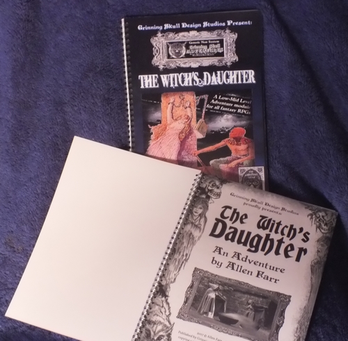 As you can see, “The Witch’s Daughter” (GSAM01) scenario was a good fit, being that the 68-page count does actually warrant such binding. I can say, the printing of the front and back cover is perfect and glossy, the interior is lovely edge to edge printing of decent quality black and white. I can’t complain about this test version.