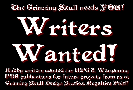Just a quick call out for anyone who would be interested in becoming an author of one of our growing range of Grinning Skull Studios PDF products for RPGers, Wargamers and other hobbyists.